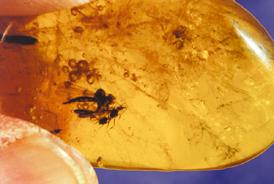 Dansfly(Empididae) and a winged ant(Formicidae). Dominican amber. |