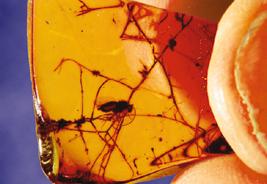 Sometimes insects snagged in spider webs get trapped in amber. This fly, however, seems to be free of the web.